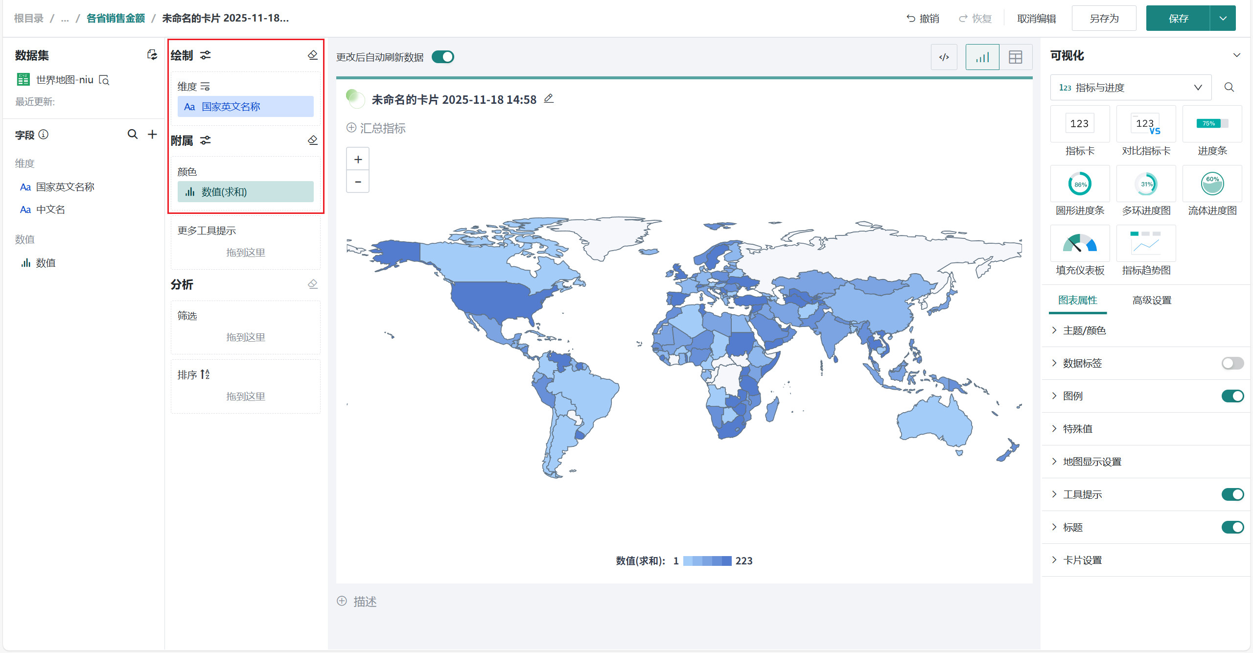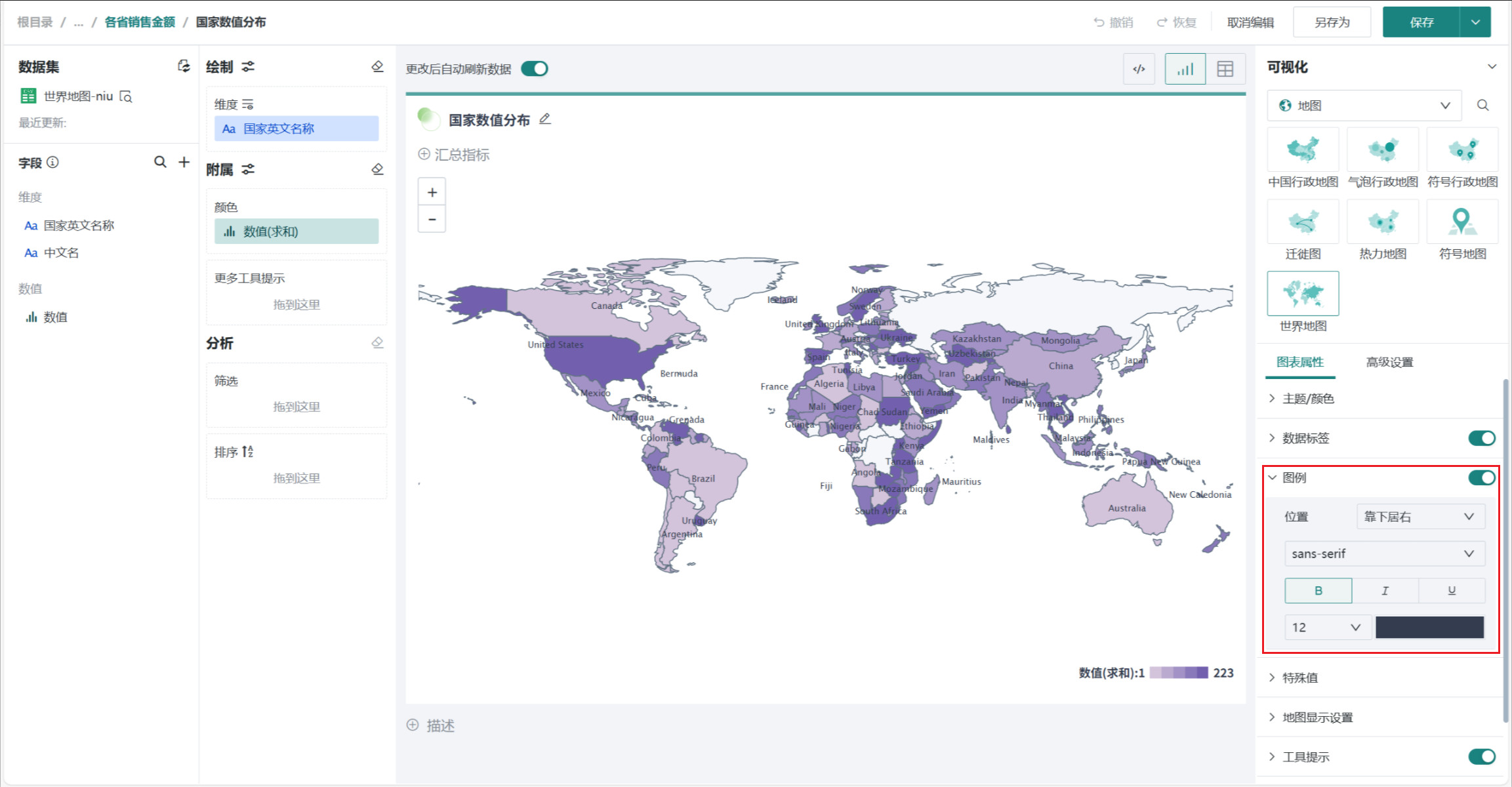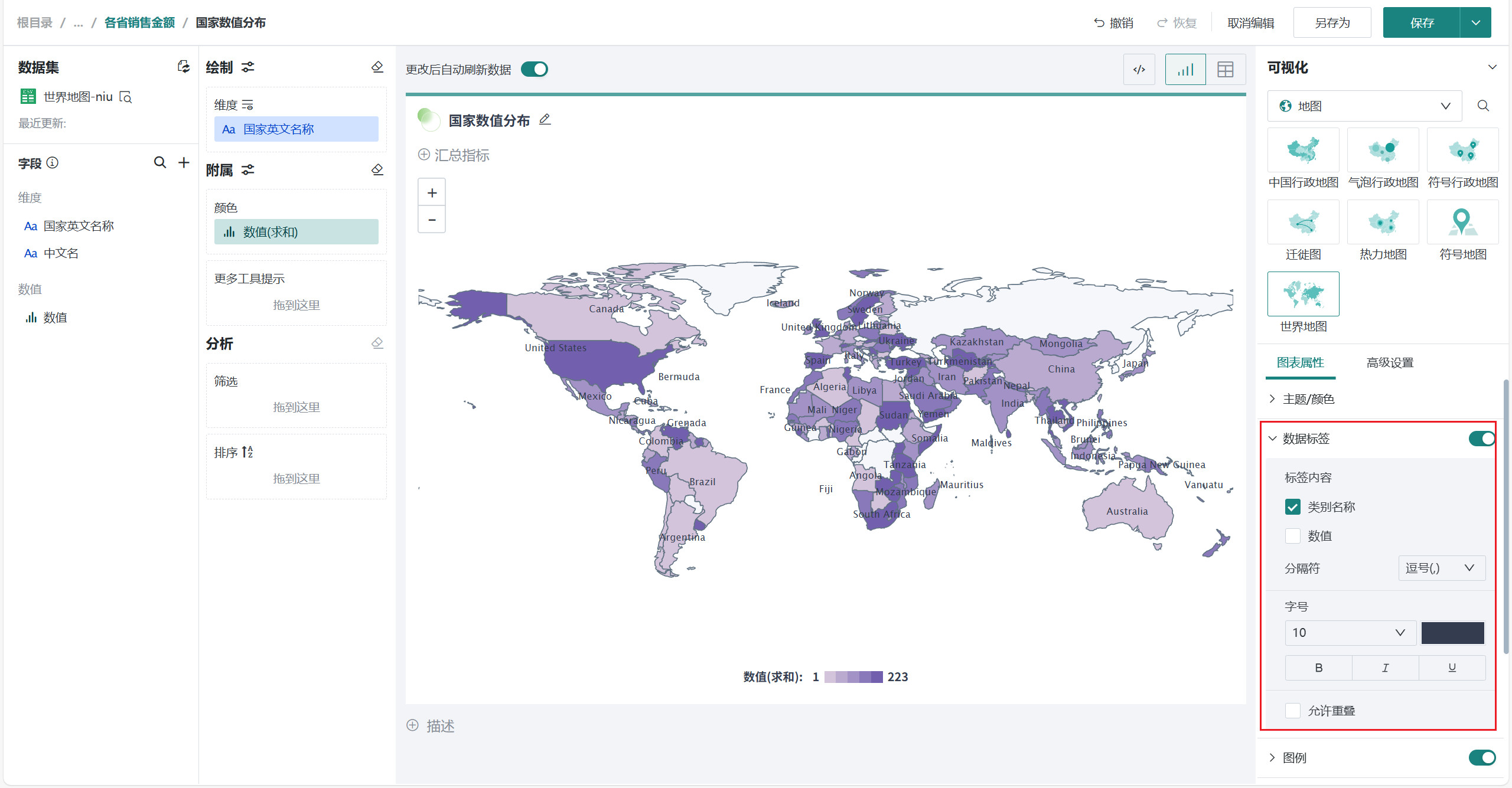 在「可视化」区域中选择「地图」类别下的「世界地图」,将左侧「字段」区域的国家/地区字段(如「国家名称」)拖至「绘制」区域的「维度」,将数值字段(如「数值」)拖入「颜色」。