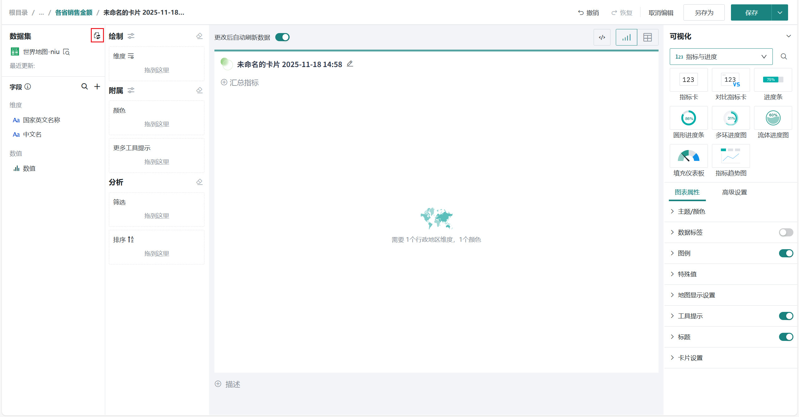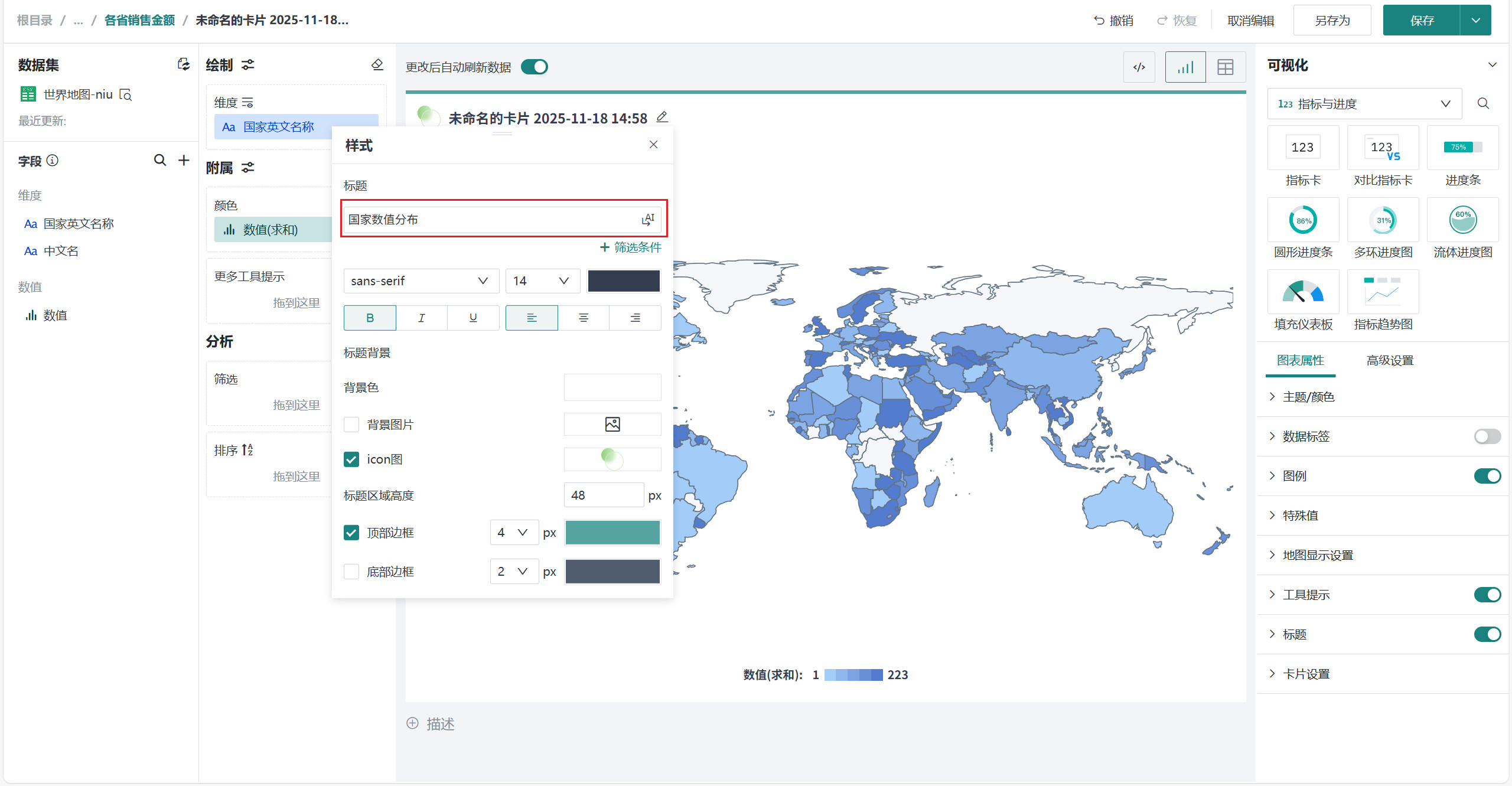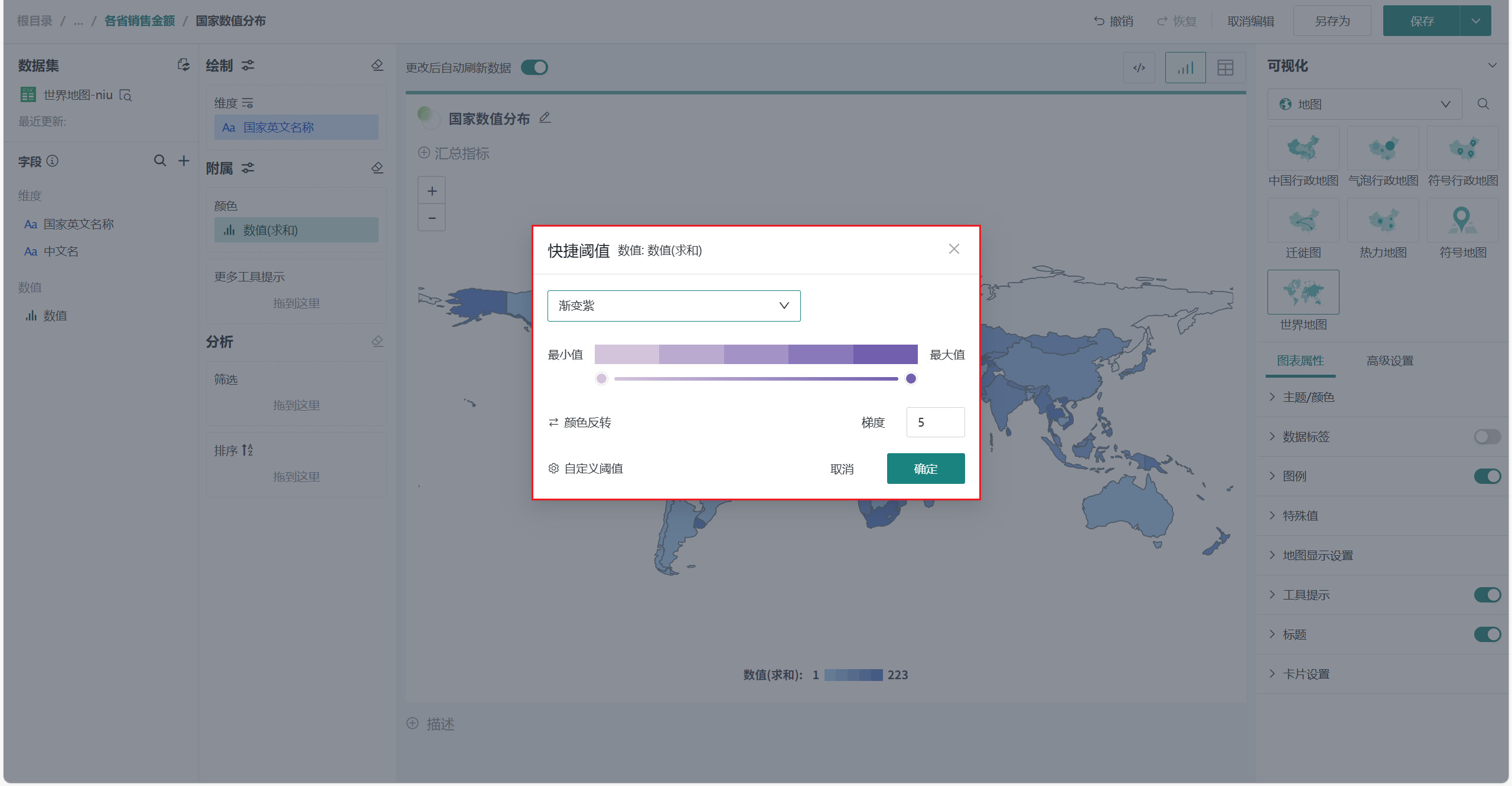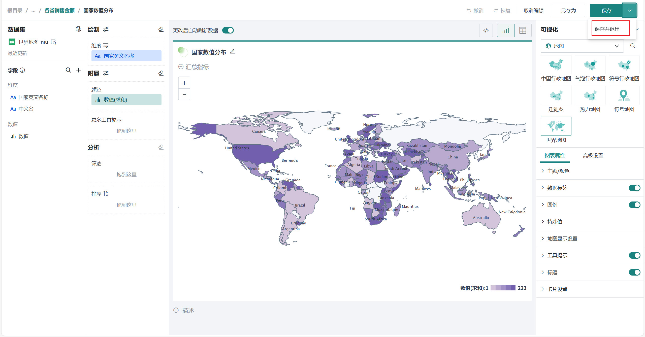 在「可视化」区域中选择「地图」类别下的「世界地图」,将左侧「字段」区域的国家/地区字段(如「国家名称」)拖至「绘制」区域的「维度」,将数值字段(如「数值」)拖入「颜色」。