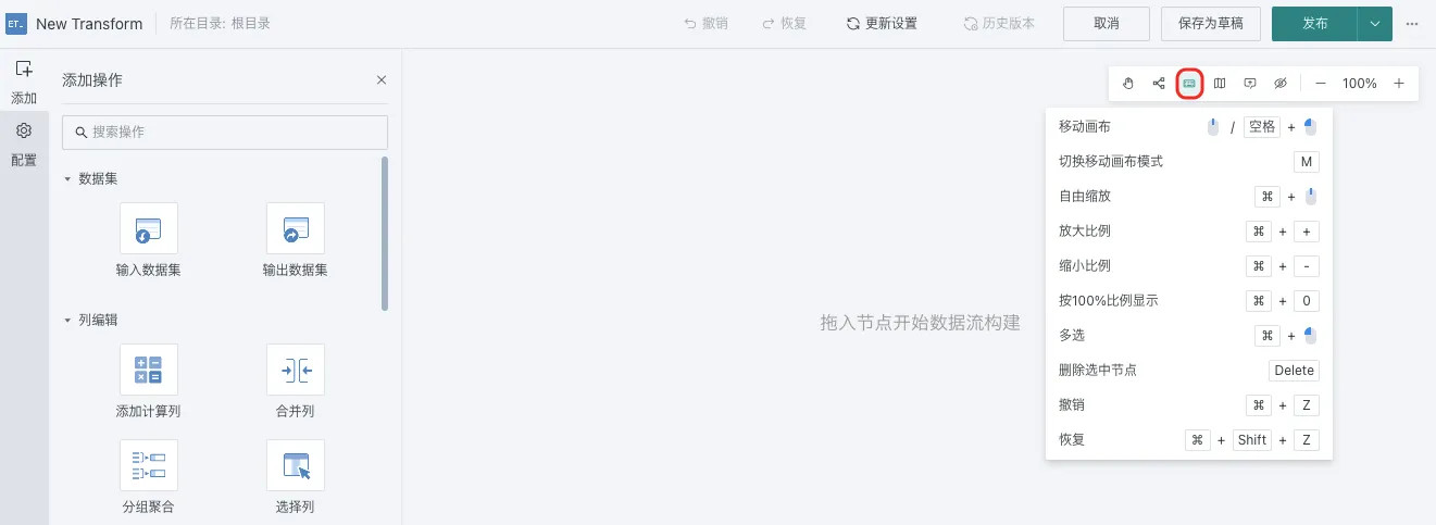 在「数据中心 > 智能ETL」界面,选择需要编辑的的数据集,单击编辑按钮进度编辑界面,单击右上角的 「操作说明入口」,即可快速查看全部的快捷键说明。