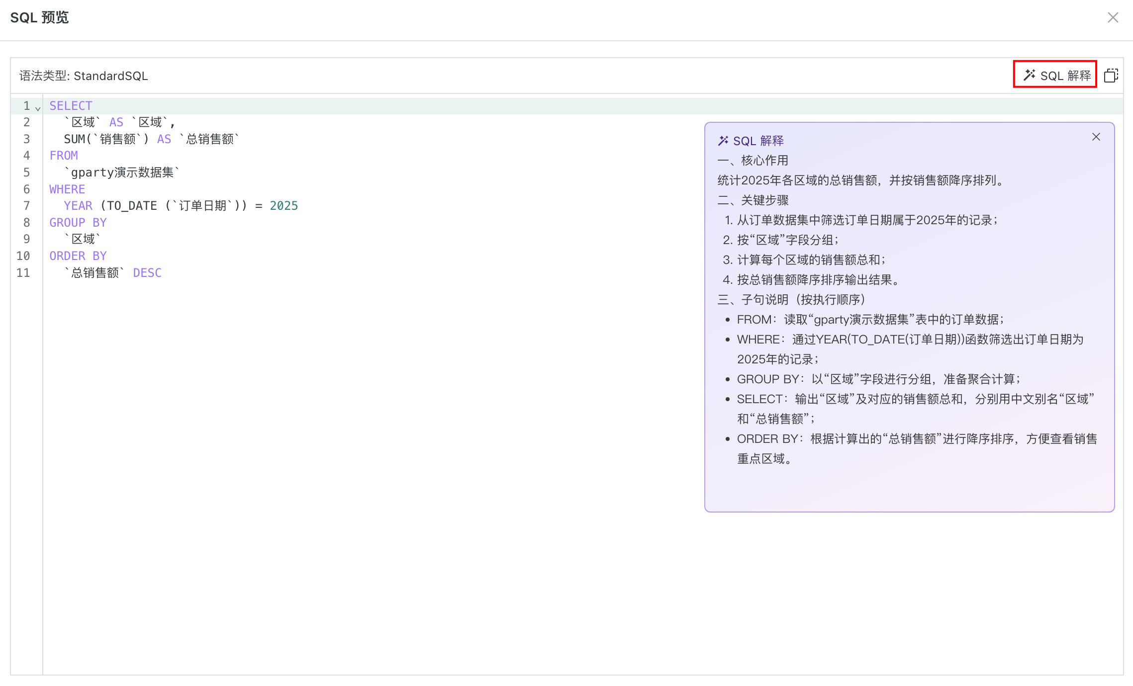 点击「SQL」,弹出「SQL 预览」页面,可在此查看 SQL 解释与复制当前 SQL。