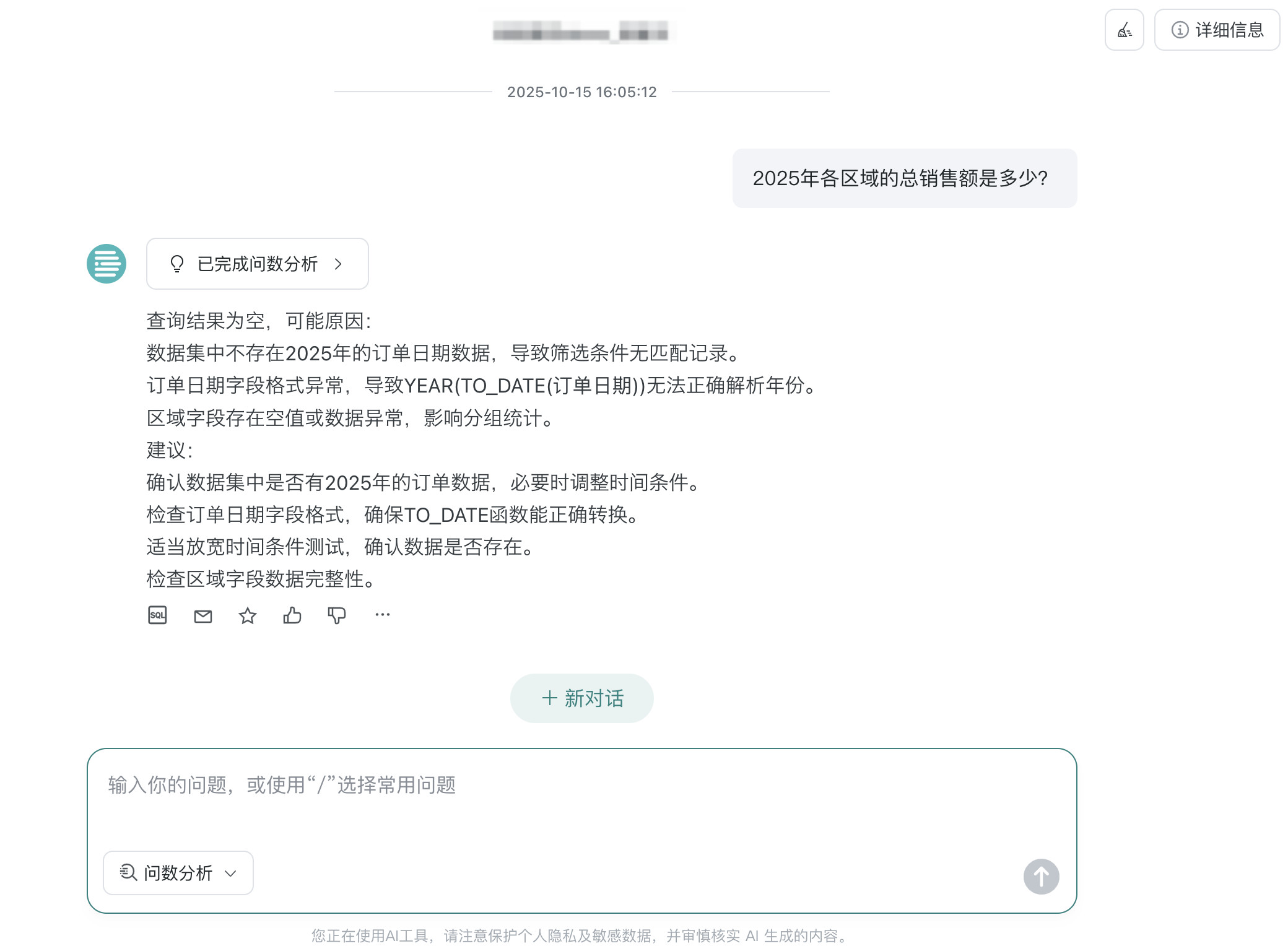 若查询为空场景,用户完成问数操作后,系统自动触发展示 0 行数据的解释内容,此时不展示图表区域,避免无意义的图表显示干扰用户,同时通过 0 行解释让用户知晓数据为空的原因。