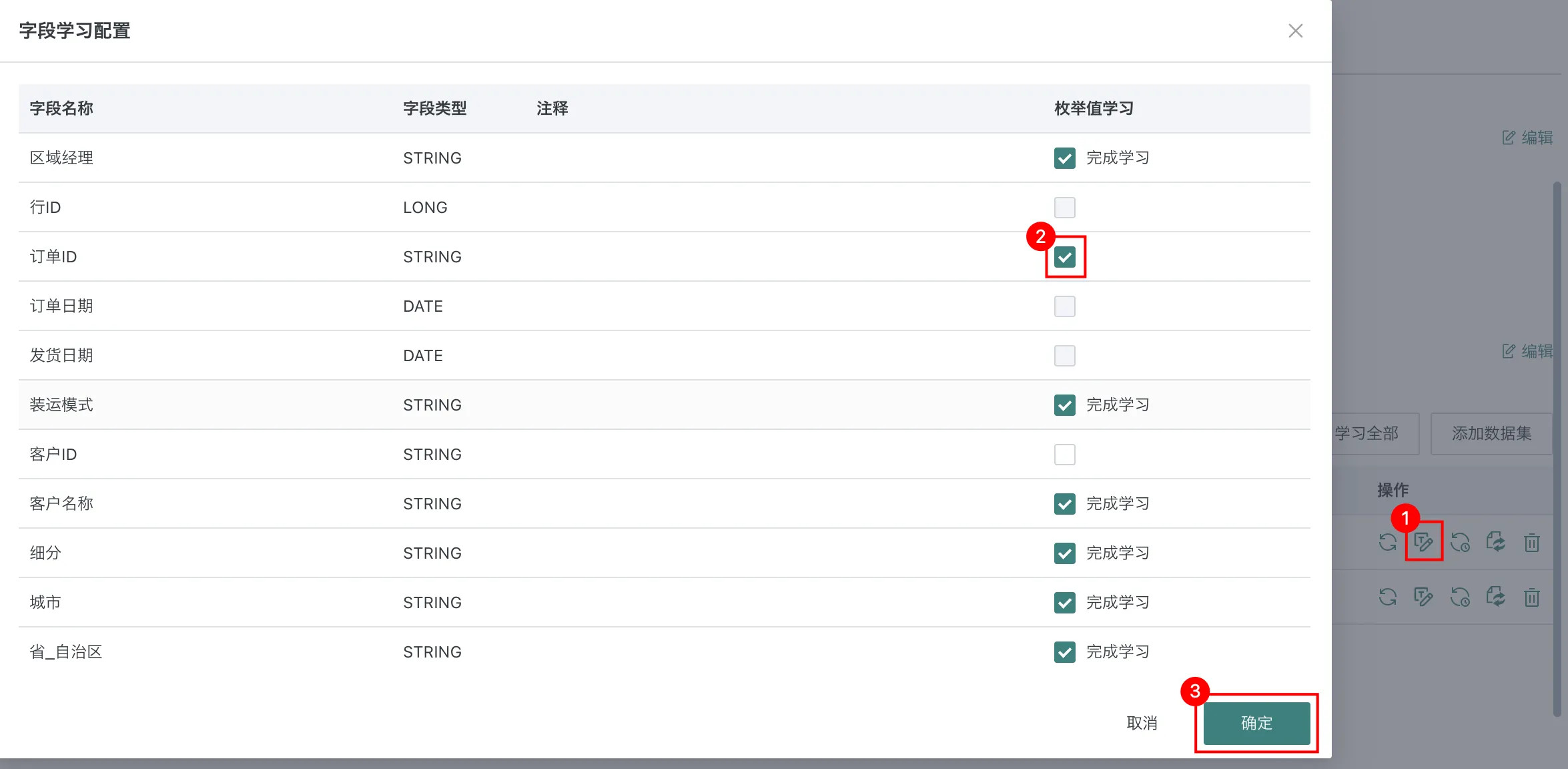 字段枚举值学习:点击数据集右侧操作栏中的「字段学习配置」按钮,在弹窗中勾选需要学习的字段,点击「确定」触发选中字段的枚举值学习。