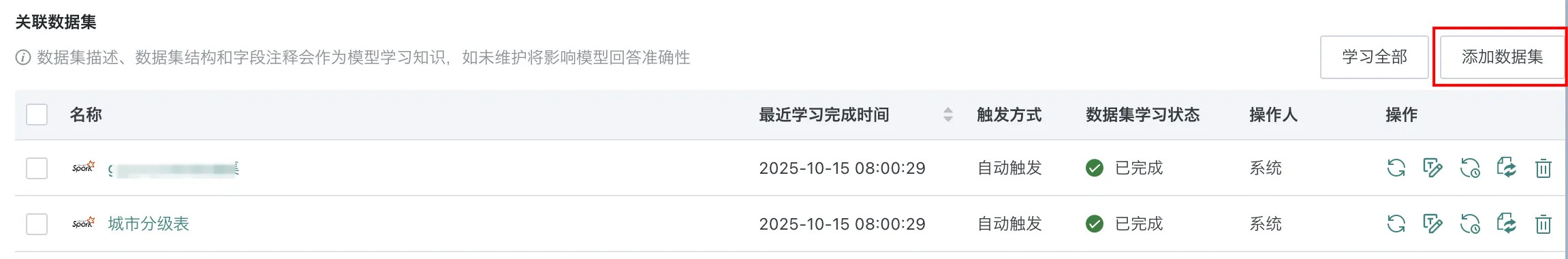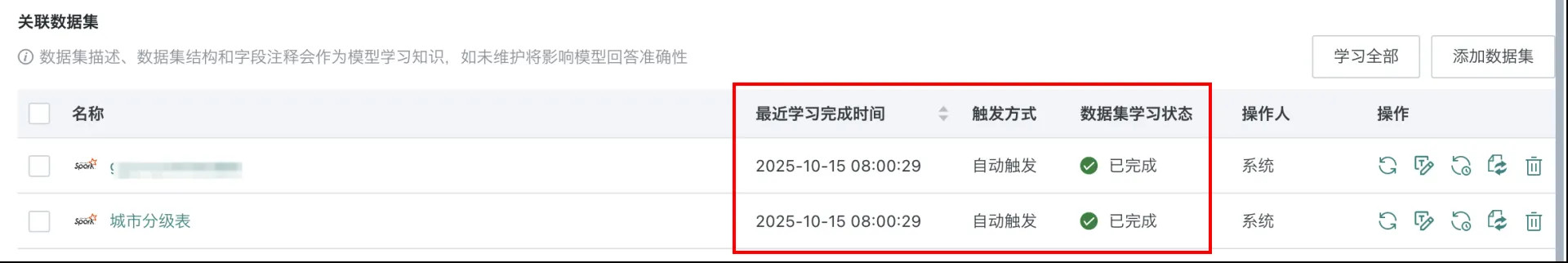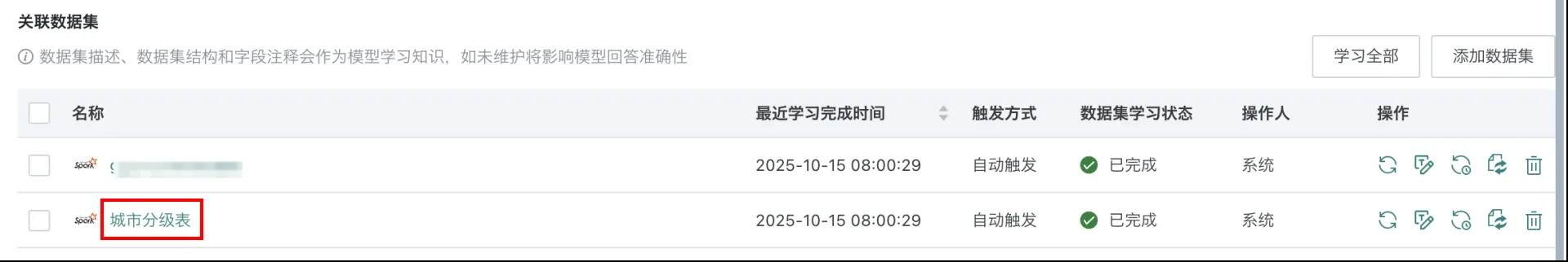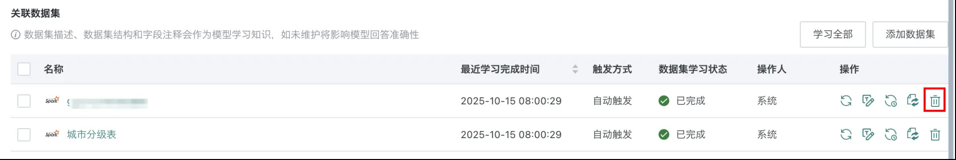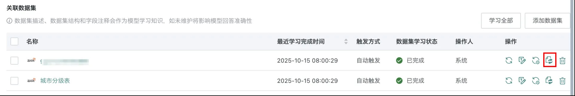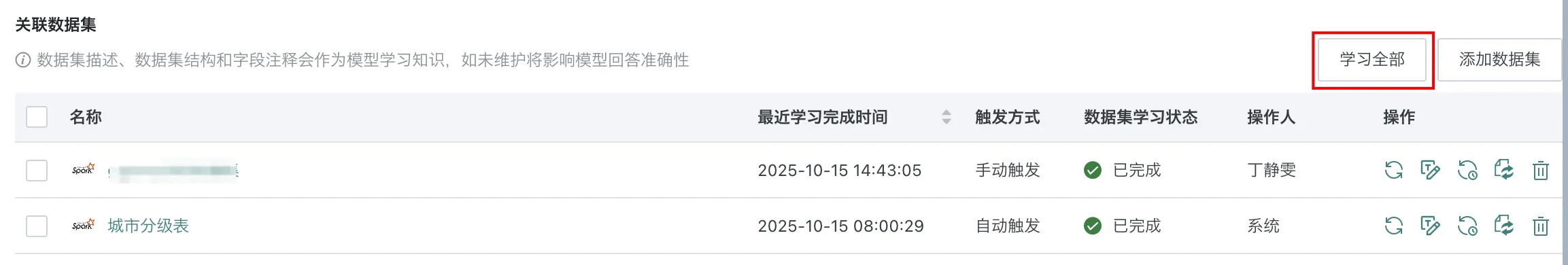 - 全部数据集学习:点击页面右上角的「学习全部」,将触发所有数据集重新学习任务。