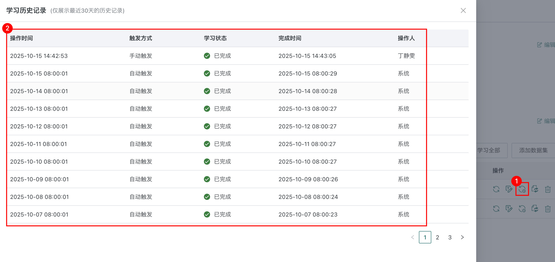 查看学习历史记录:点击数据集右侧操作栏中的「学习历史记录」按钮,即可查看该数据集最近30天的学习历史记录。