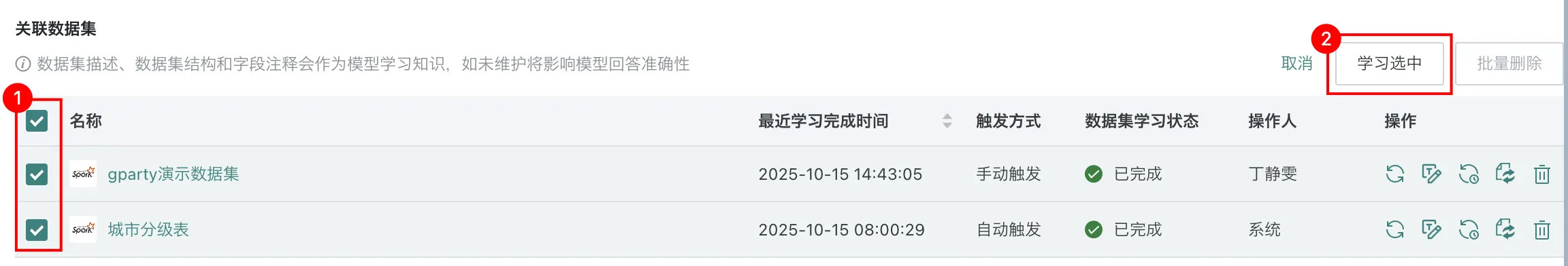- 批量数据集学习:勾选多个需要学习的数据集,进入批量操作状态,点击「学习选中」即可批量触发所选数据集的学习任务。