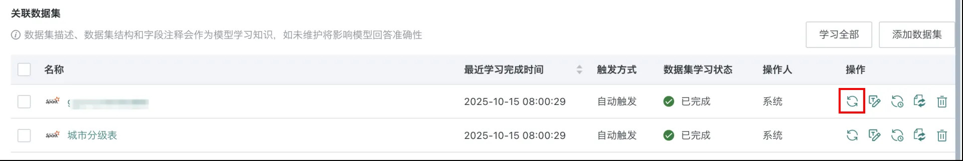 - 单个数据集学习:点击数据集右侧操作栏中的「刷新」按钮,即可触发该数据集的单独学习任务。