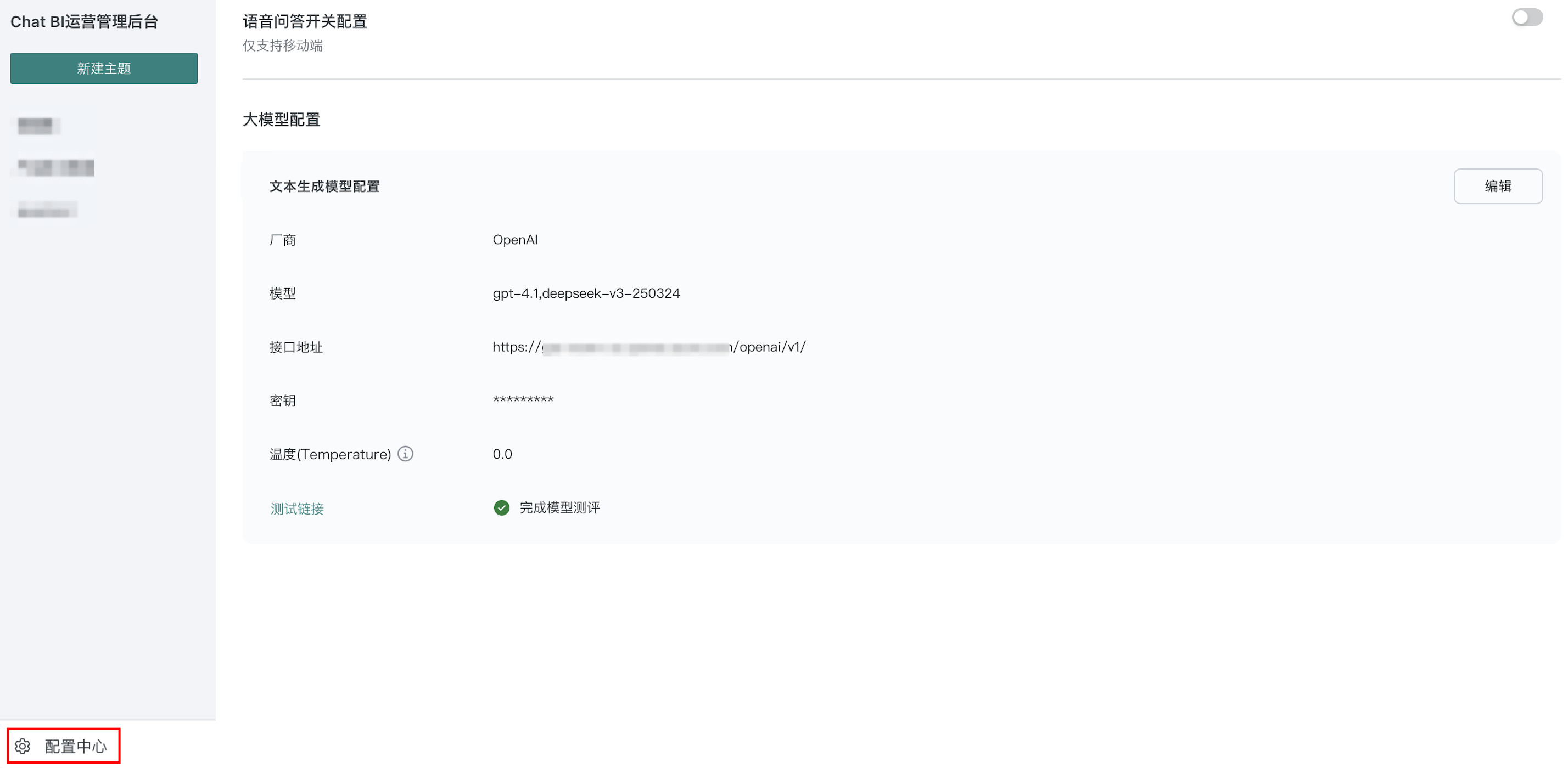 配置中心可设置语音问答开关,也可对大模型的厂商、模型、接口等参数进行配置与测试,以保障 ChatBI 相关功能的正常运行。