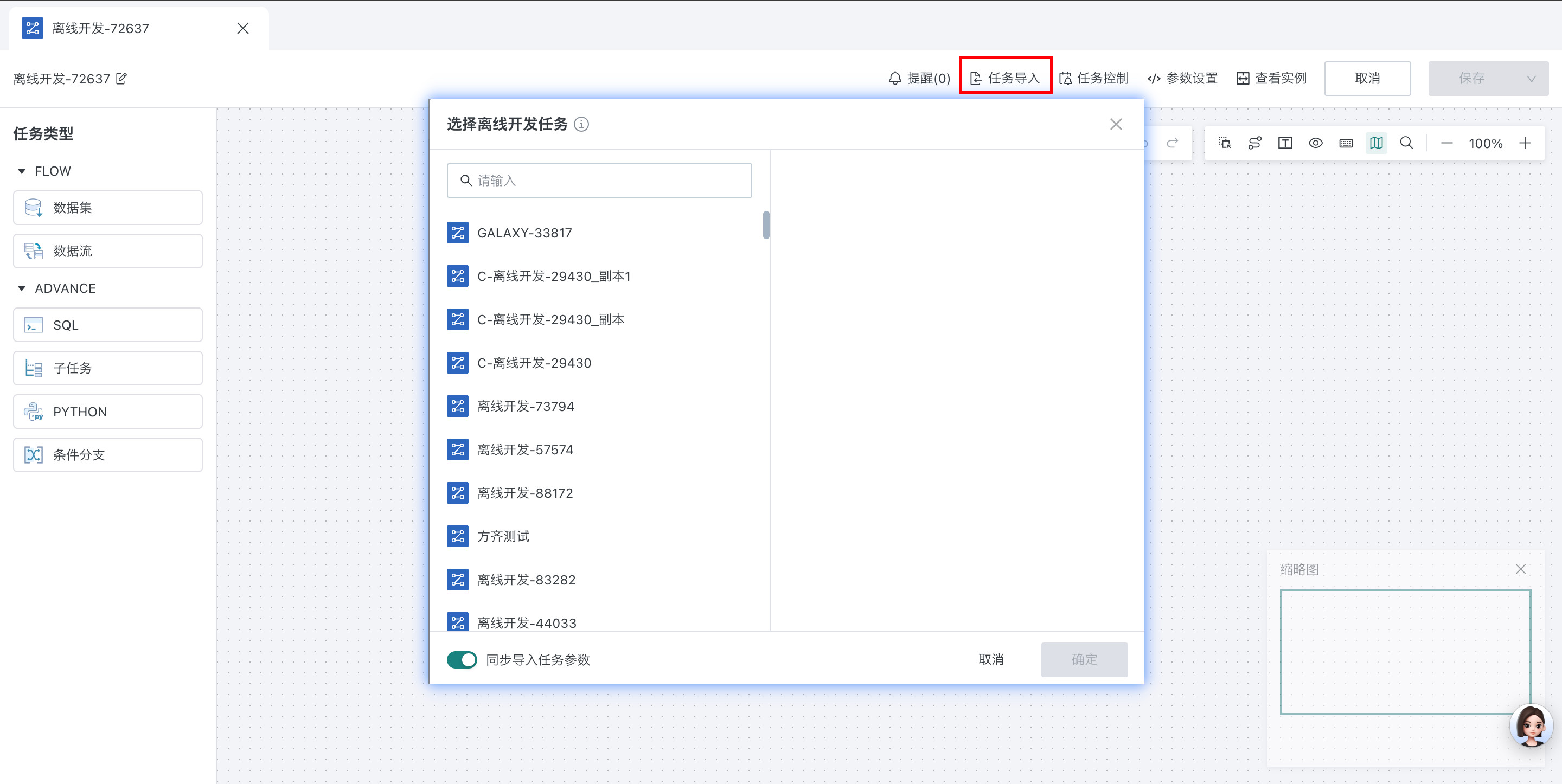 离线开发任务支持导入覆盖,选择有权限的离线开发任务后进行导入,导入的内容有节点配置、任务参数(可选择不导入)、子任务的关联关系,子任务中的配置、任务级别的超时控制、调度配置、告警配置不做迁移。