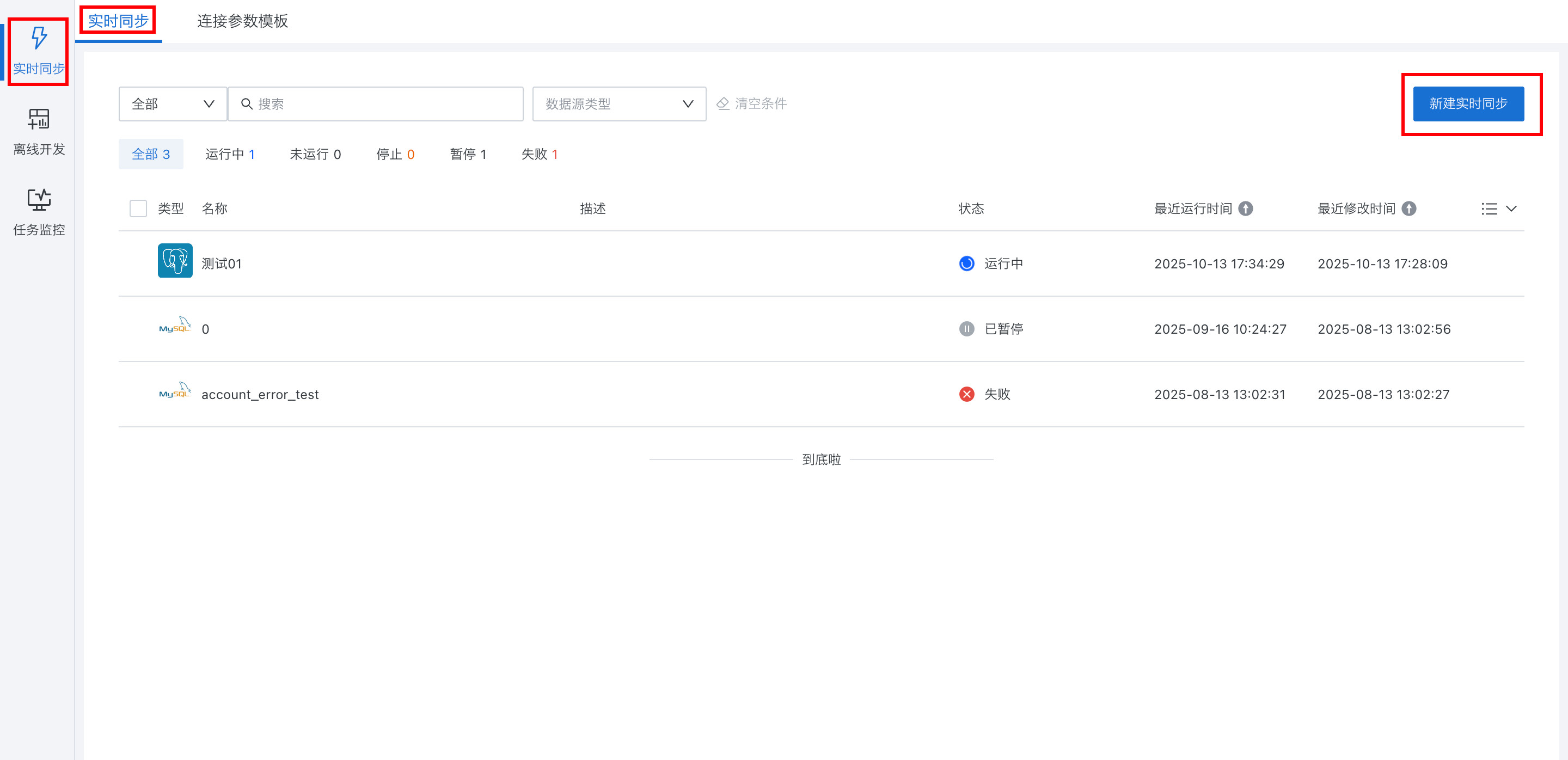 完成数据账户、数据库环境、实时同步环境准备配置后,可创建实时同步任务,将多种类型的数据源输入输出进行配置,完成实时同步任务的创建。