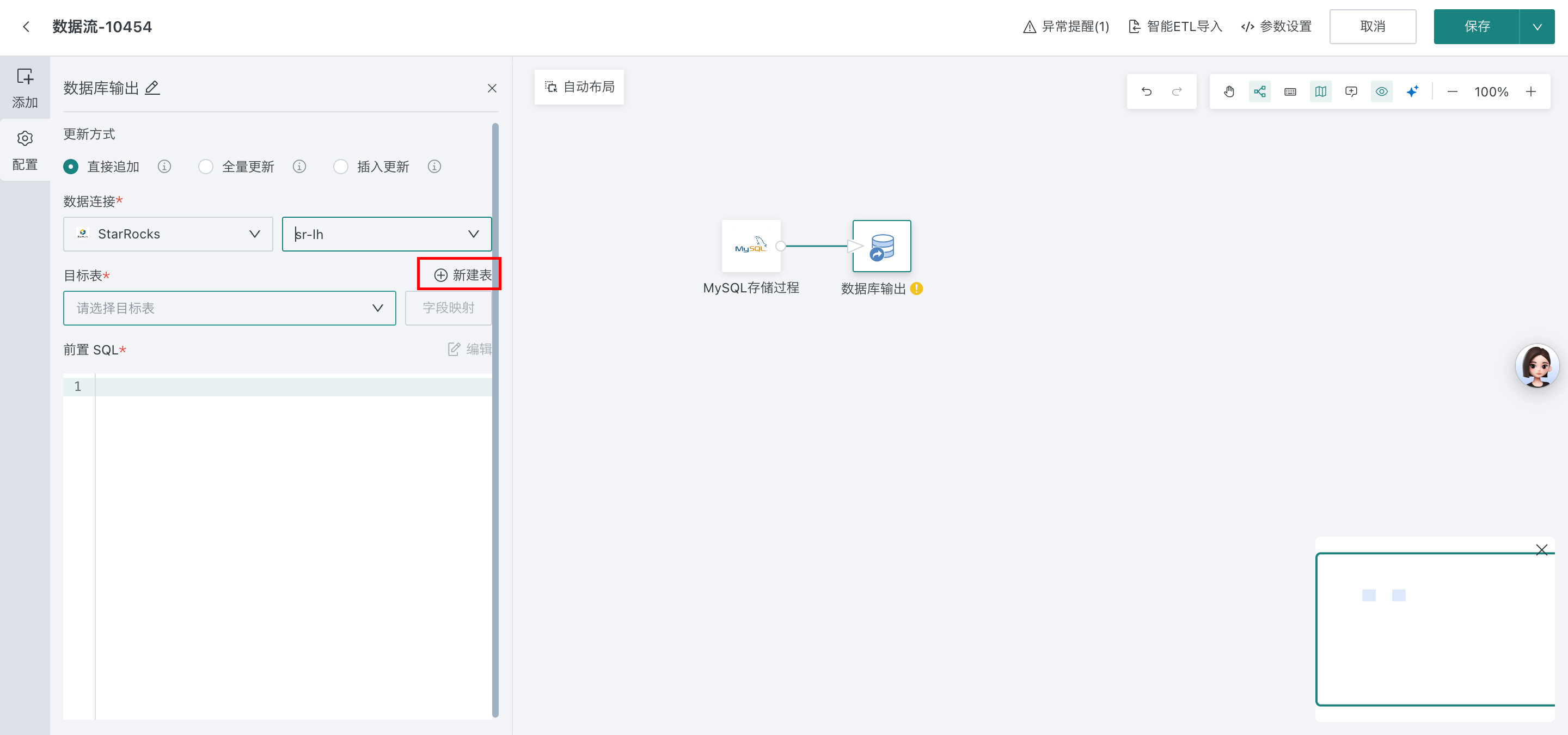 在离线开发数据流中,拖拽「数据库输出」节点,点击该节点弹出节点配置页面,点击页面中的「新建表」。