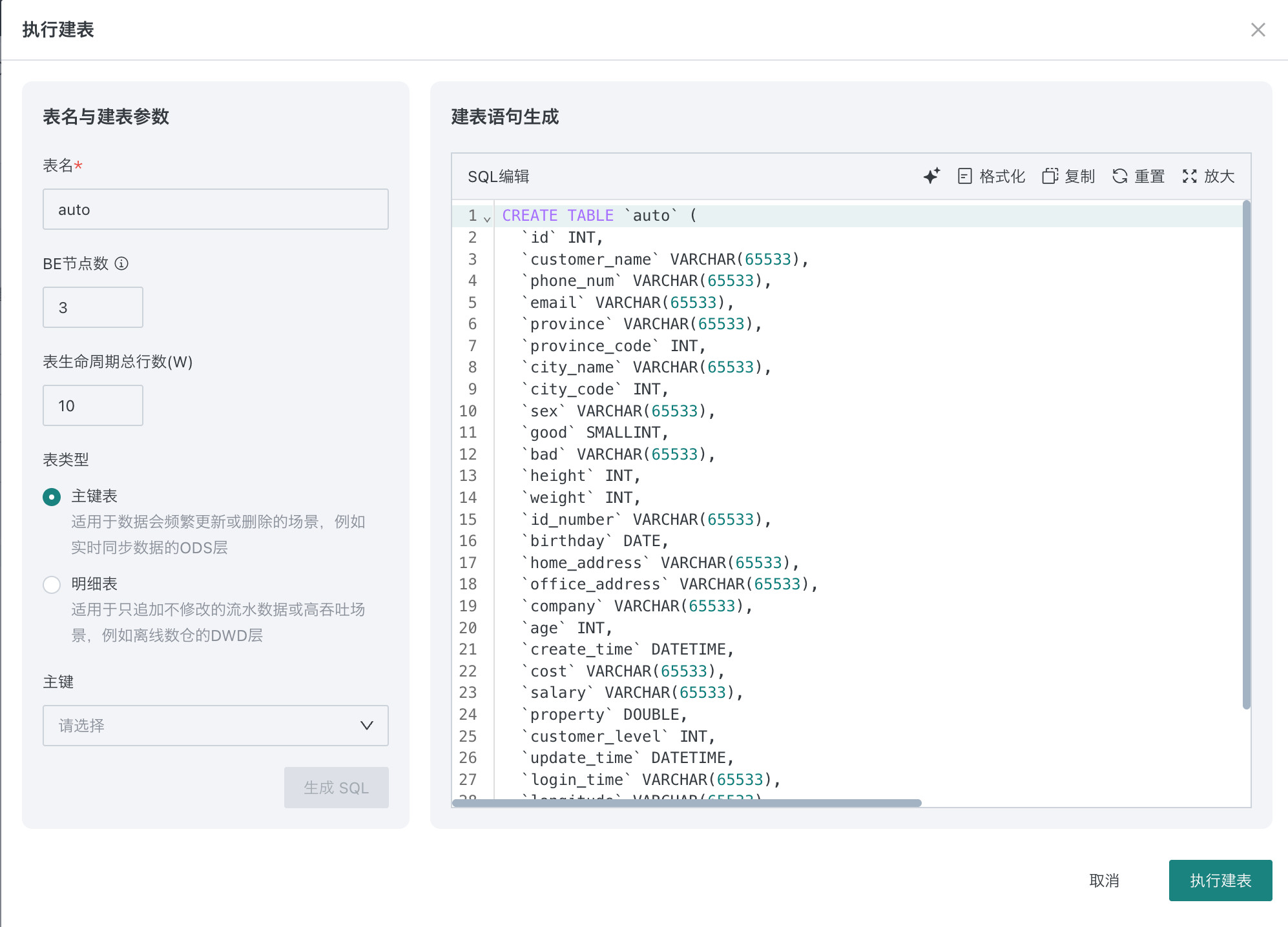 - 表名:必填项,输入数据库表名,对于一些常见数仓,通过配置专属参数,生成更科学的建表语句。