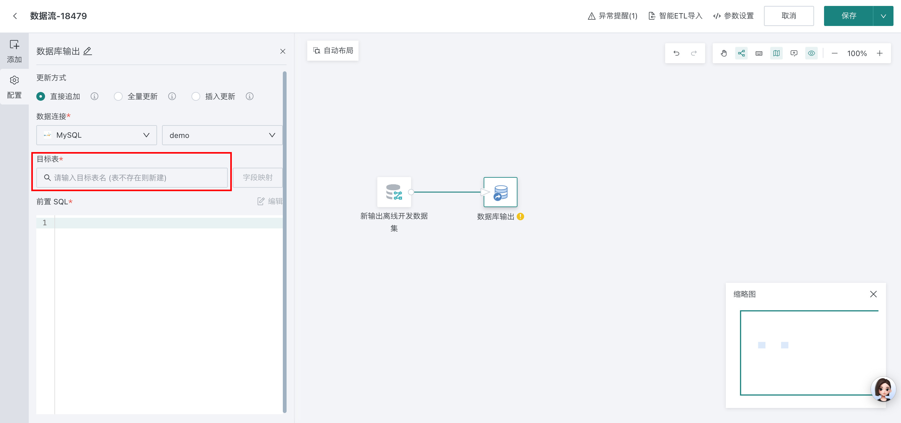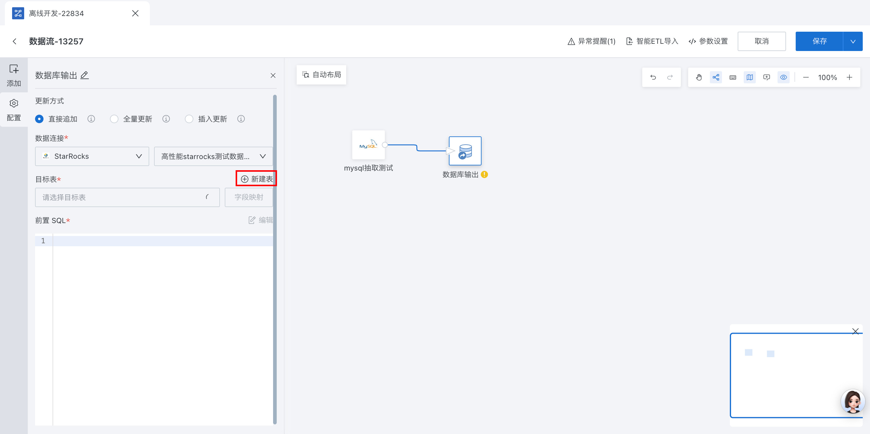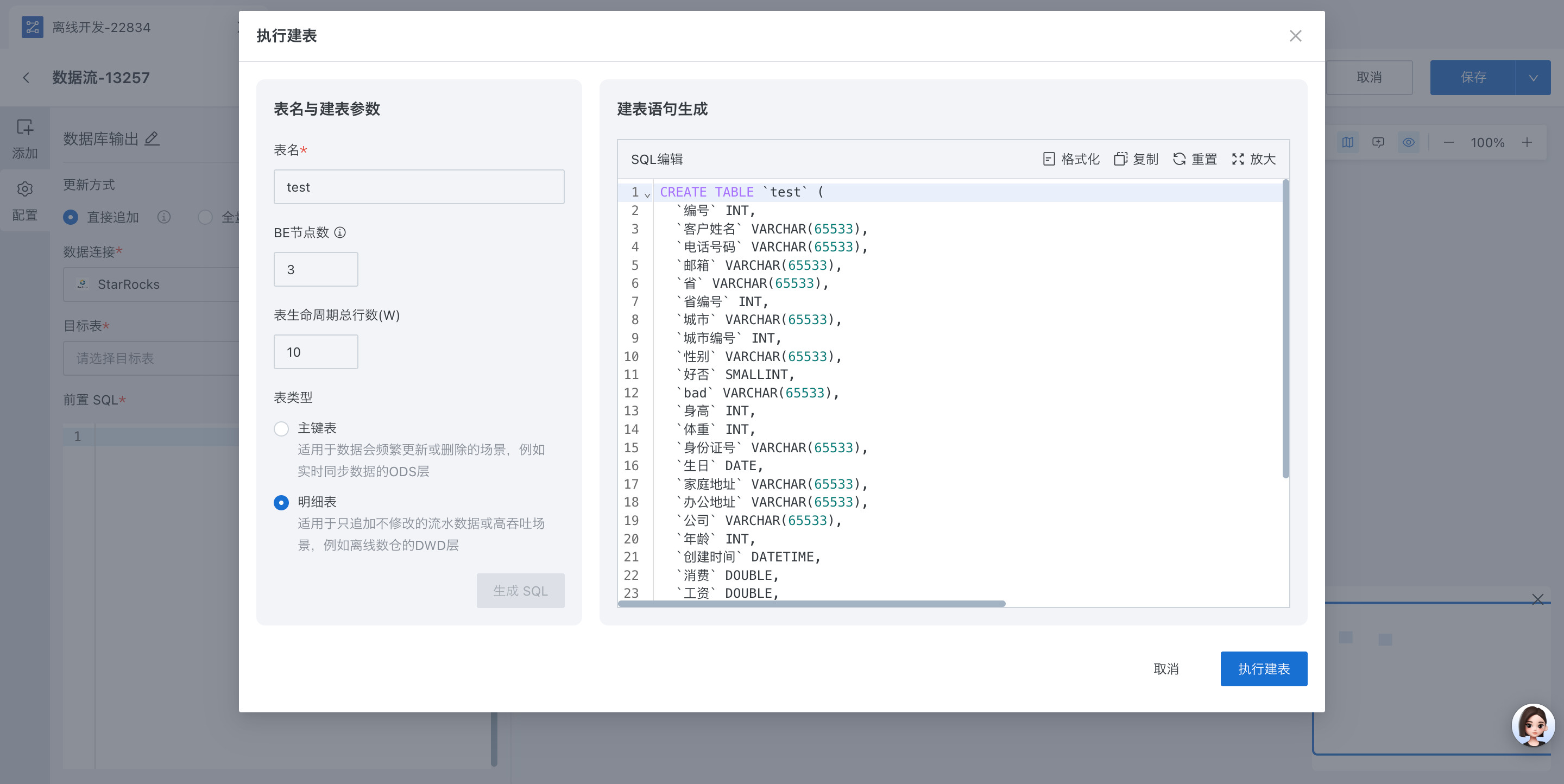 数据流数据库输出节点支持创建数据模型