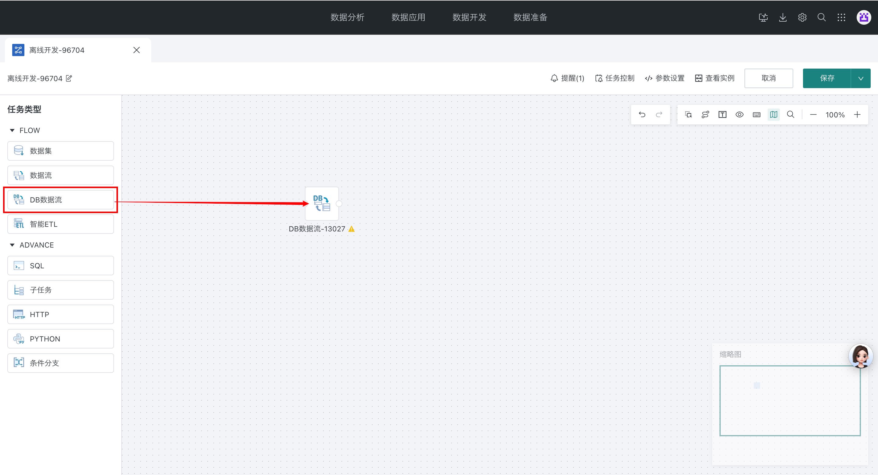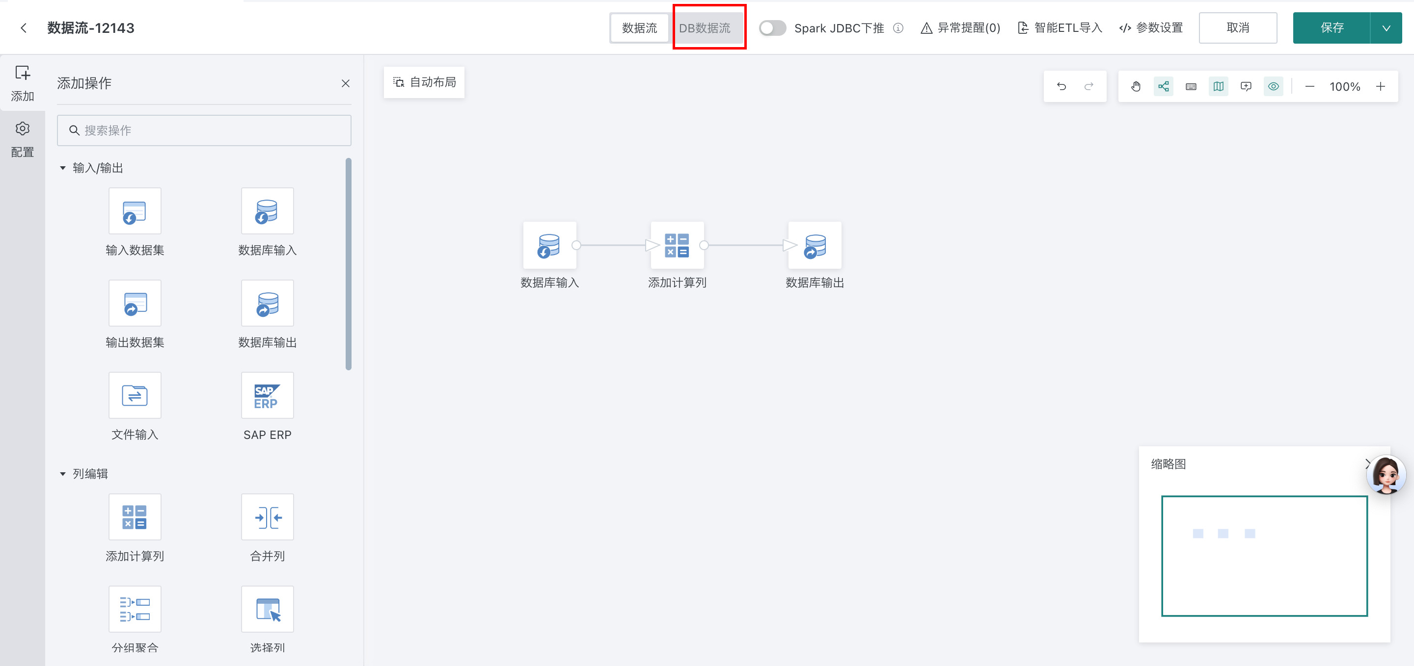 数据流中的ETL算子运行时一般使用spark算力,新增DB数据流节点,运行DB数据流会将ETL计算逻辑转化为数据库支持的SQL语言,下推到数据库运用数仓算力计算。