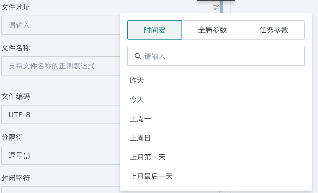 - 文件名称:根据填写的正则表达式在指定FTP目录下获取匹配的文件,如果获取多个文件将针对所有文件进行union操作,文件名称支持引用参数;