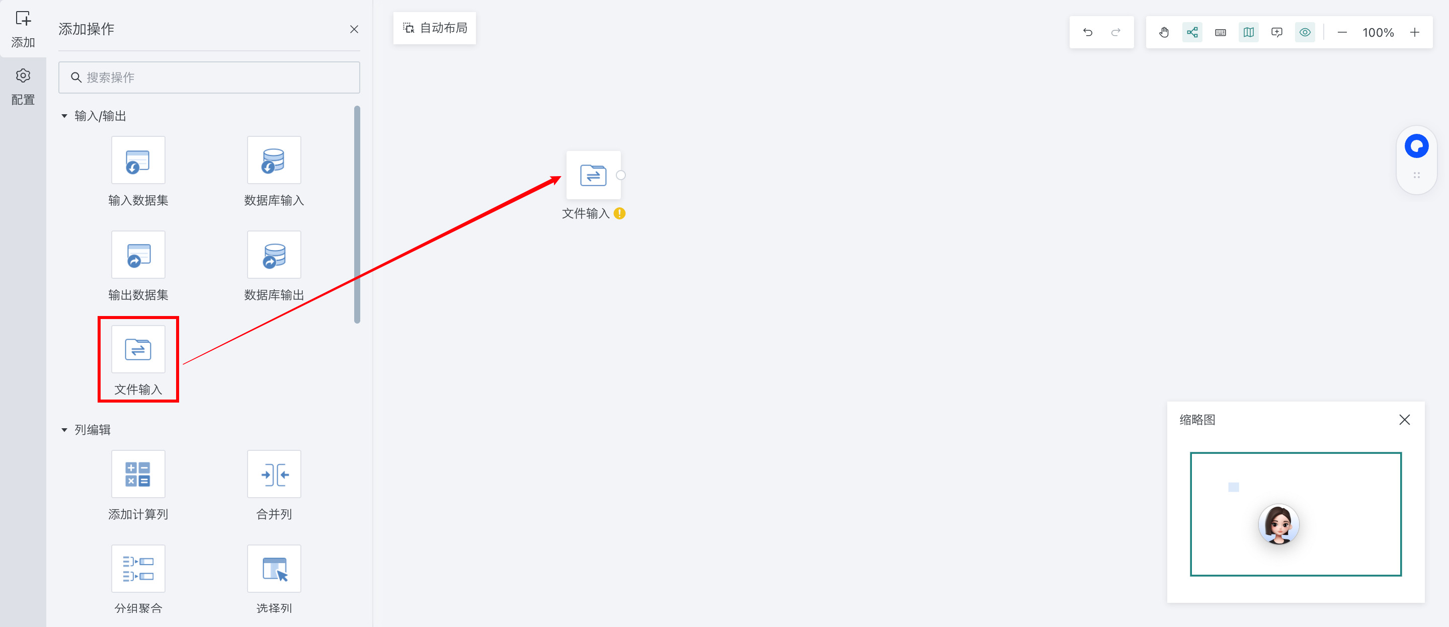 - 将数据流算子区的 文件输入 算子拖入右侧画布编辑区;