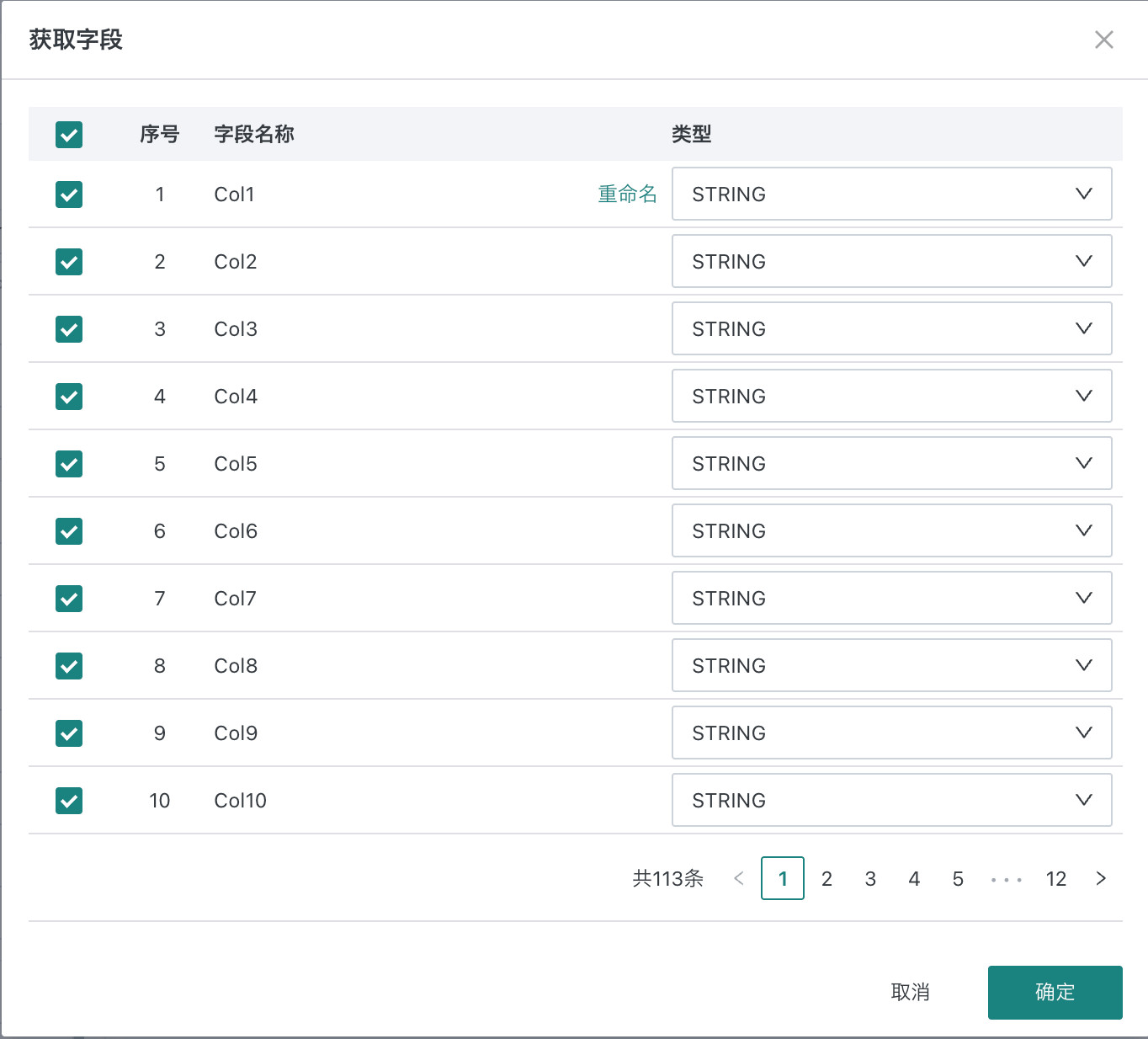 - 点击获取字段,自动解析数据类型,可修改字段名和字段类型,可选择部分字段作为下游算子的输入;