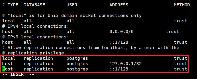 本文示例中,pg_hba.conf 文件在/var/lib/pgsql/12/data目录下,使用vi /var/lib/pgsql/12/data/pg_hba.conf(用户根据实际情况修改 pg_hba.conf 所在路径)语句编辑该文件,把下图中红圈中的两行前边的 # 去掉: