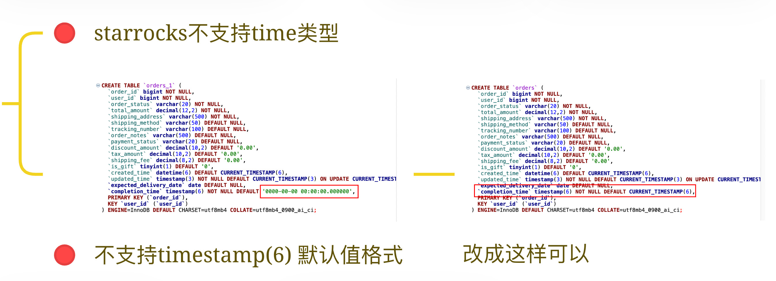 StarRocks建表语句不支持timestamp的默认值格式,建议给一个default值