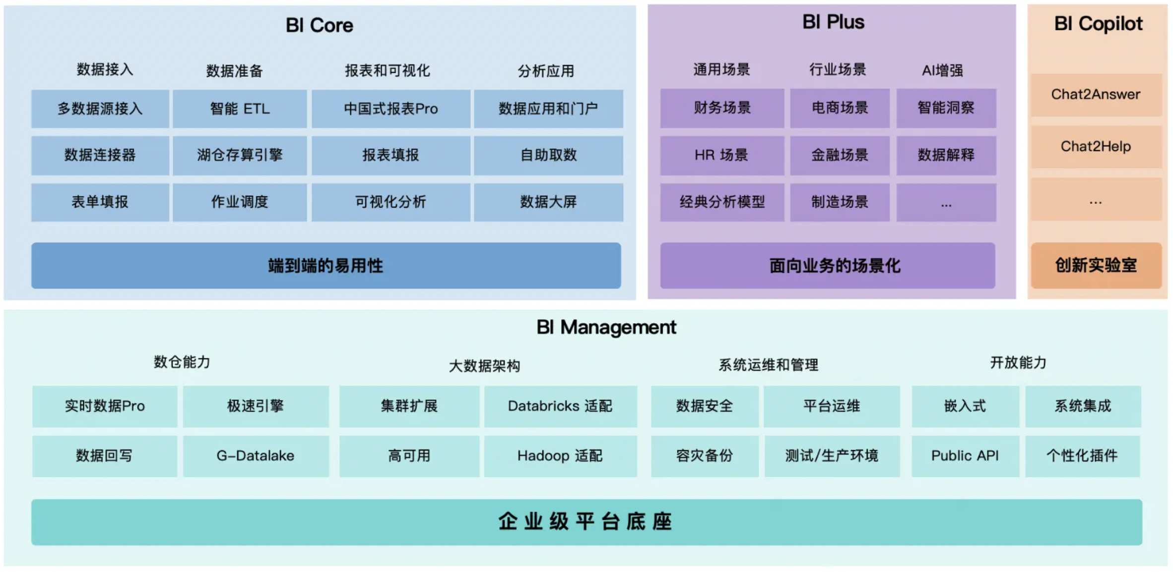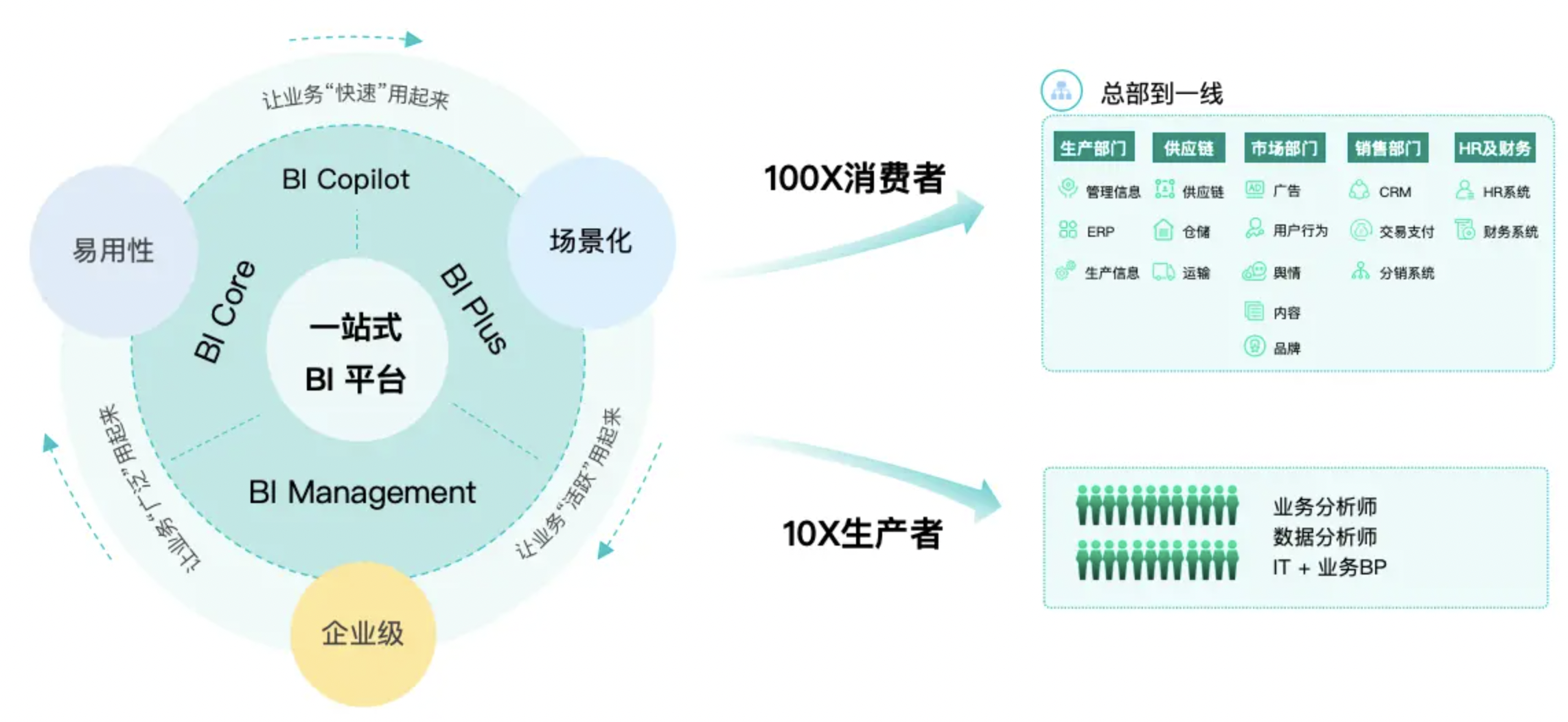 That is, a BI platform has three core key points: ease of use that allows business to "quickly" use it, scenario-based features that make business "actively" use it, and enterprise-level capabilities that enable business to "widely" use it. It also meets the diverse needs of multiple functional roles for close collaboration, adapts to multiple business scenarios such as enterprise operations and sales analysis, and integrates the multi-product needs of data warehouses, reports, and BI+AI with a one-stop characteristic, achieving full-chain intelligent decision-making in one stop.