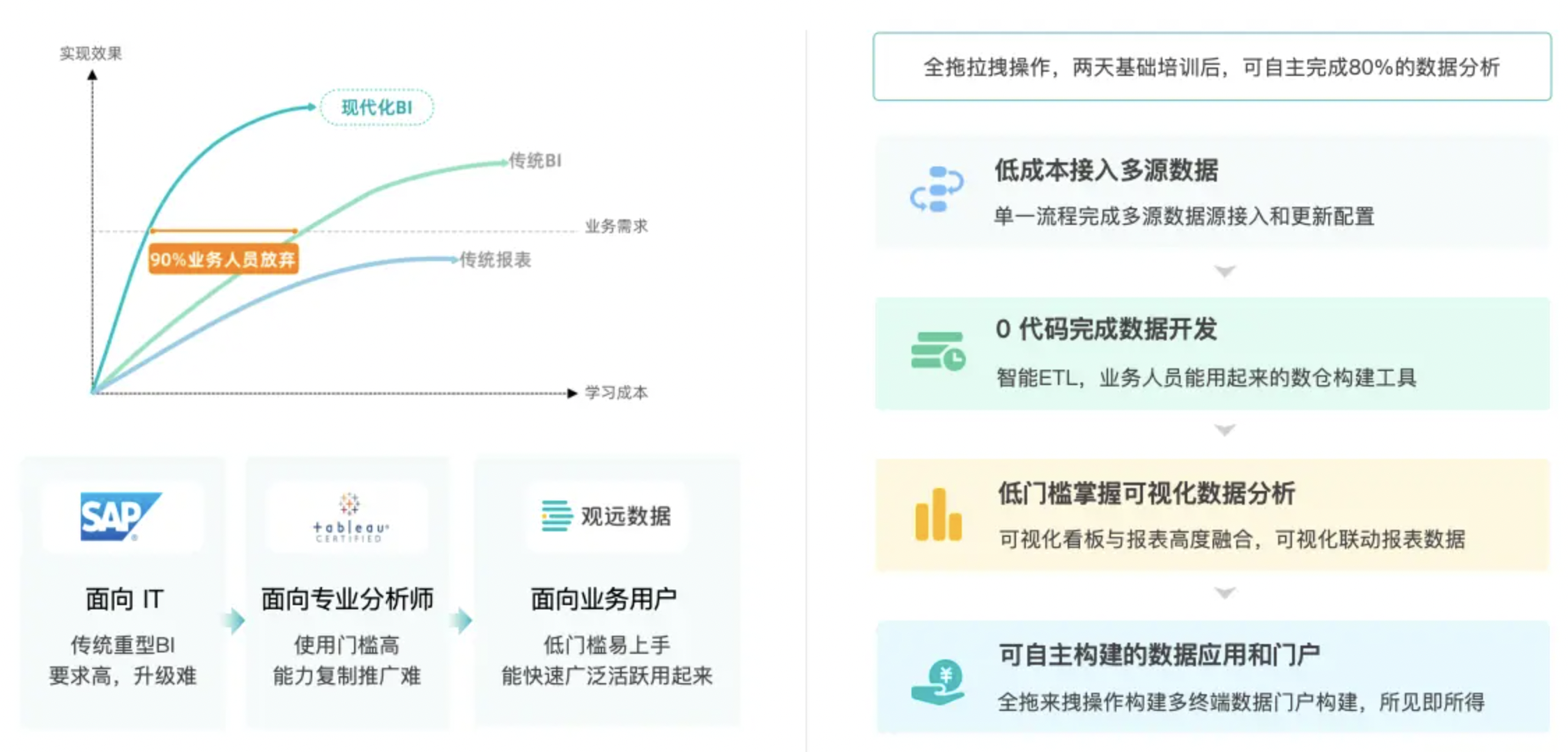 Based on the above various pain points, we believe that modern BI can only "make business use it" and leverage 10X-100X business user agile decision-making, ultimately promoting enterprise organizational agile decision-making and even agile digital transformation, after possessing the core characteristics of ease of use, enterprise-level, scenario-based, and one-stop.