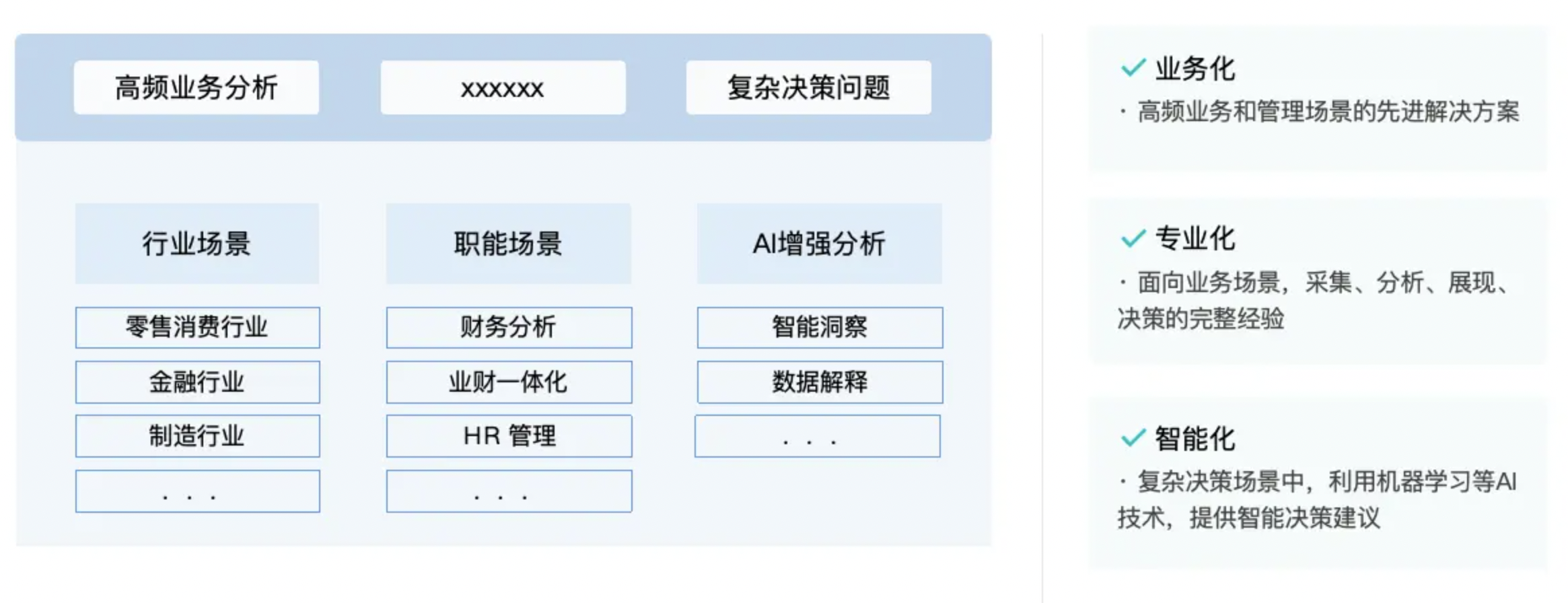 We package typical enterprise data analysis scenarios as "plug-and-play scenario-based analysis suites" for enterprises to use. We hope that enterprises in various industries at different digital development stages can quickly implement data application and analysis capabilities required by business at minimum cost, and in various analysis scenarios, more users can quickly understand data from a professional analyst's perspective, accelerating response to market and enterprise problems, truly making business "actively" use it.