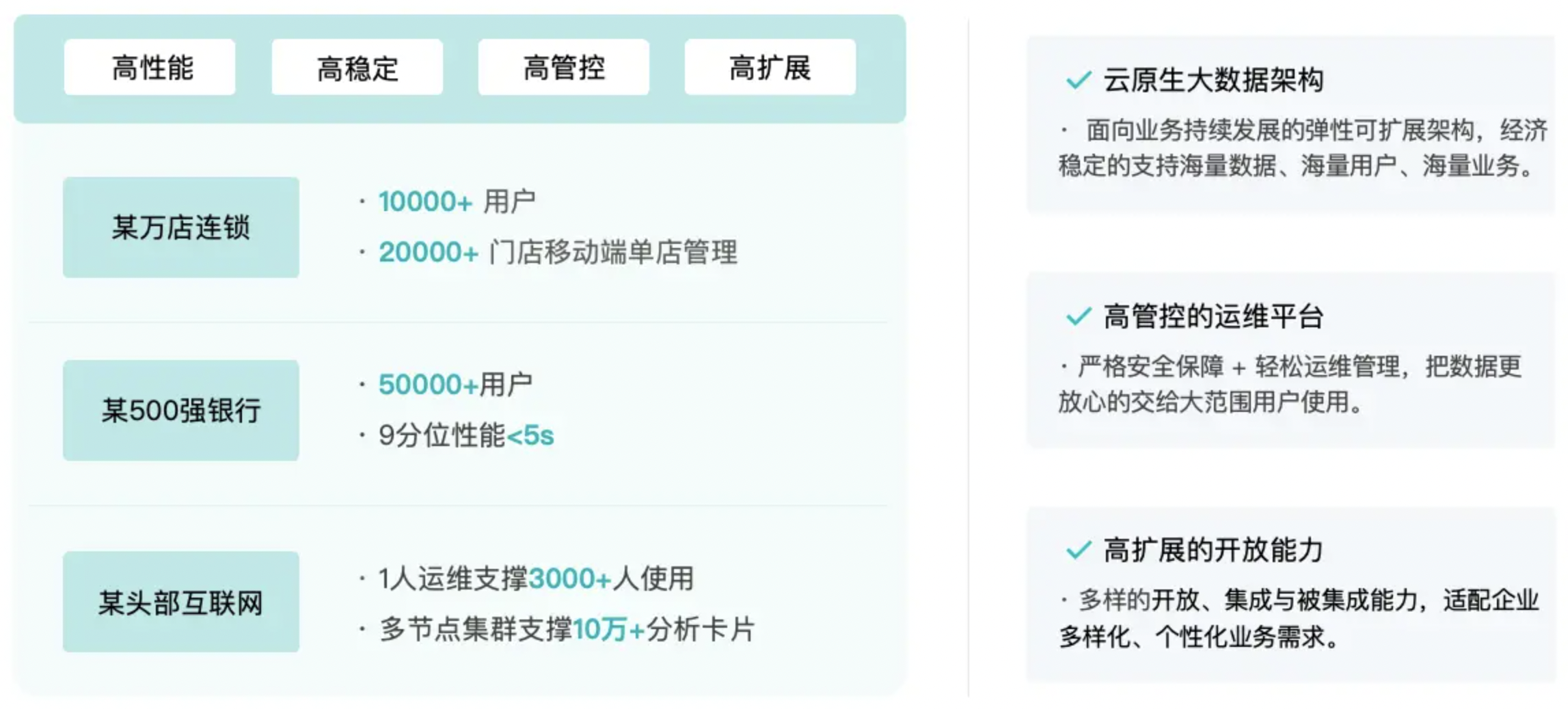 With the continuous growth of enterprise business scale, every tool and every business line will generate massive amounts of data, even reaching single-table billion-level or total data volume PB-level scale. Traditional BI and data warehouses cannot meet the storage and analysis needs of large-scale data, often experiencing performance bottlenecks such as slow data query response and slow computing processing speed. Generating a data analysis report takes half a day. Meanwhile, complex system integration and compatibility situations test both IT teams and enterprise-level applications' technical support for scaled business development. Traditional BI architecture is relatively old and single, difficult to adapt to rapid data changes and dynamic scalability needs. Additionally, when enterprise user numbers increase, high-performance, high-concurrency, high-stability, and high-security enterprise-level capabilities also become essential. To address these challenges, modern BI often leverages distributed computing capabilities from big data and cloud-native technologies to meet real-time processing and analysis of massive data. Elastic scaling enables BI systems to maintain effective resource utilization and stable operation under different data loads and business scenarios, with unlimited elastic expansion to adapt to enterprise future needs of billions, trillions, or even trillions of data.
