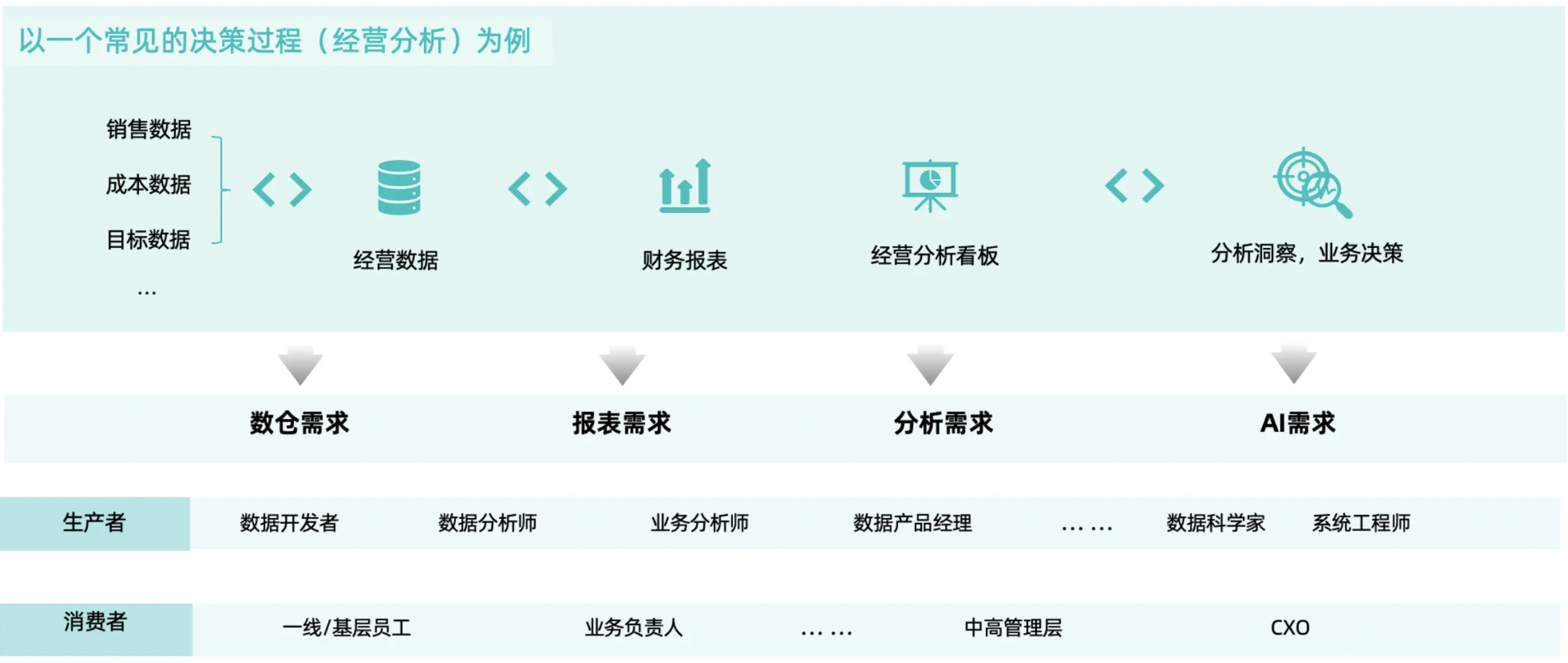 Taking the most common business analysis decision-making scenario as an example, from raw data such as sales data aggregated into data analysis models, to financial reports and business analysis dashboards, and then to generated analysis insights and business decisions, this entire series of processes involves various roles and differentiated behaviors of various departments in the enterprise organization. From the perspective of this decision-making scenario chain, it involves four main scenario needs: data warehouse needs, report needs, analysis needs, and AI needs. This modern BI platform considering integrated business helps enterprises achieve higher efficiency and higher quality business decision-making levels at minimum cost, improving the overall competitiveness and innovation capabilities of enterprises.