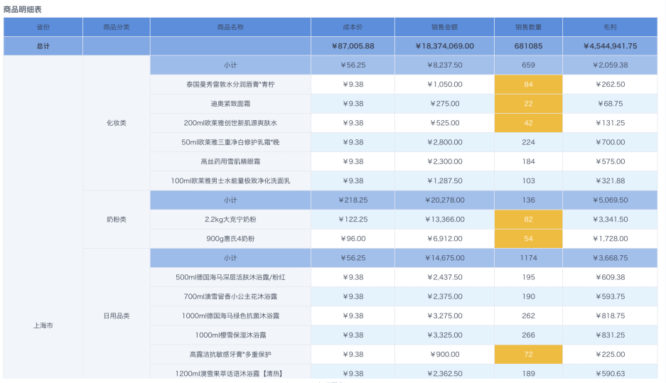 You are a data analyst at an e-commerce company. One day, you need to create a report on national product sales, analyzing content including product sales rankings, category sales proportions, regional product sales details, etc. You also need to highlight products with low sales quantities in certain regions, as shown in the figure below: